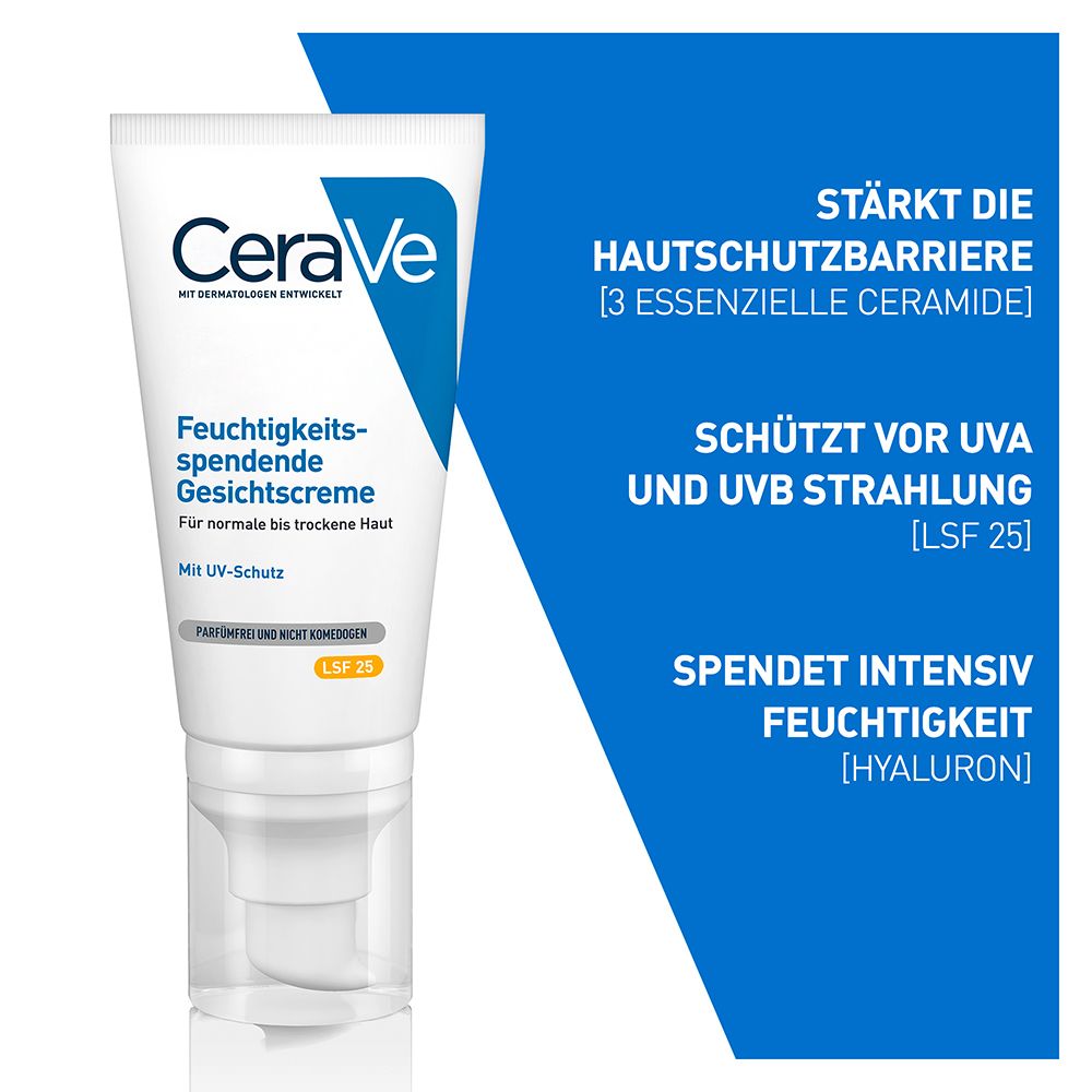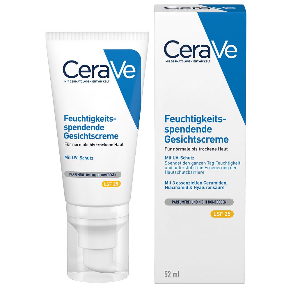 Besondere Eigenschaften der CeraVe Feuchtigkeitsspendenden Gesichtscreme mit LSF 25 Die Tagespflege bietet dank Lichtschutzfaktor 25 einen Breitbandschutz vor UVA- und UVB-Strahlung Während Hyaluron und Glycerin intensive Feuchtigkeit spenden, tragen essenzielle Ceramide zur Stärkung der natürlichen Hautschutzbarriere bei. Die Gesichtscreme sorgt für eine langanhaltende Pflegewirkung dank patentierter Wirkstoff-Freisetzung