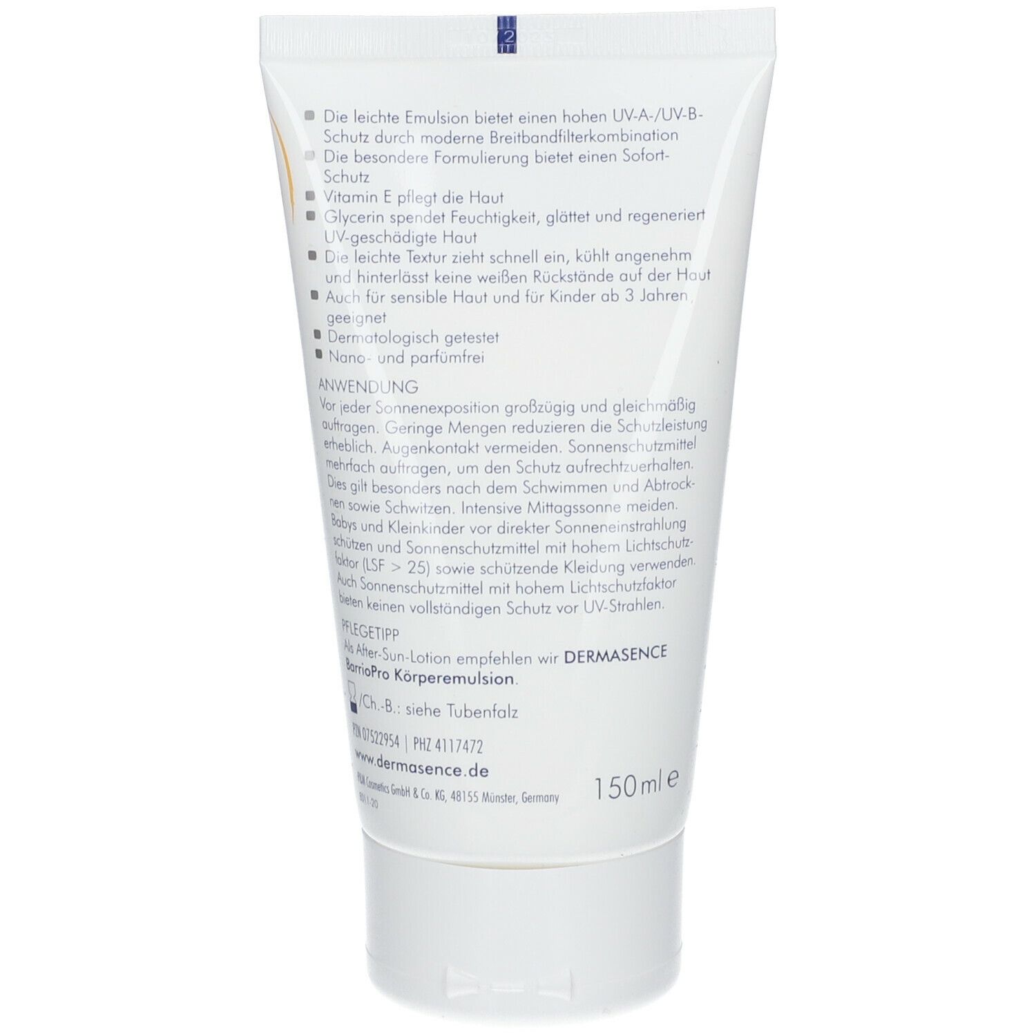 Anwendung: Vor jeder Sonnenexposition großzügig und gleichmäßig auf Gesicht und Körper verteilen. Geringere Mengen reduzieren die Schutzleistung. Mehrfach auftragen, insbesondere nach dem Aufenthalt im Wasser, Abtrocknen oder Schwitzen. Halten Sie sich trotz Verwendung eines Sonnenschutzmittels nicht zu lange in der Sonne auf. Säuglinge und Kleinkinder nicht direkter Sonneneinstrahlung aussetzen. Pflegetipp: Als Aftersun-Lotion empfehlen wir DERMASENCE Skinpro Hydro mit Vitamin E.