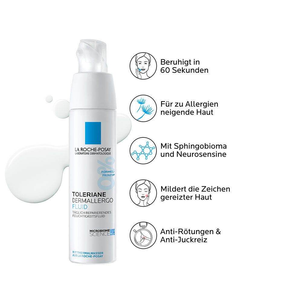Das TOLERIANE Dermallergo Fluid von La Roche-Posay versorgt empfindliche Haut, die zu Allergien neigt, sofort mit Feuchtigkeit und beruhigt sie. Das leichte Fluid wirkt Hautirritationen entgegen und reduziert Rötungen. Dank seiner besonderen Hautverträglichkeit beruhigt das Fluid die Haut sofort, reduziert Irritationen und wirkt Rötungen sowie einem erneuten Auftreten entgegen. Die Hautpflege enthält Sphingobioma, das die Funktion des Mikrobioms unterstützt, sowie Neurosensine und Thermalwasser aus La Roche-Posay. Diese Wirkstoffe sorgen für ein angenehmes Hautgefühl. Die leichte Formel ohne Alkohol und Duftstoffe bewahrt den natürlichen Feuchtigkeitshaushalt der Haut und schützt die Hautbarriere.