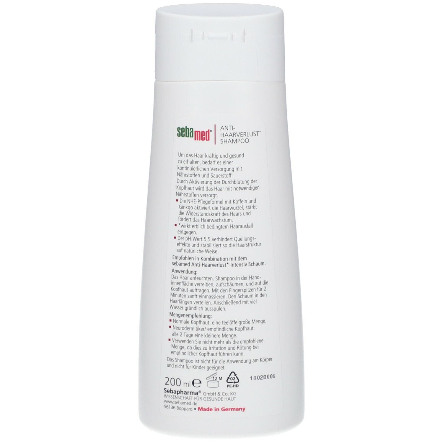 Das sebamed Anti-Haarverlust Shampoo enthält eine NHE-Pflegeformel mit Coffein und Ginkgo biloba, welche die Durchblutung der Kopfhaut anregt und somit optimale Wachstumsbedingungen für kräftiges und gesundes Haar schafft. Durch die regelmäßige Anwendung des Shampoos wird das Wachstum von gesundem Haar gefördert, die Widerstandskraft des Haares gestärkt und erblich bedingtem Haarverlust entgegengewirkt. Der pH-Wert von 5,5 fördert die Erhaltung des natürlichen Hautschutzmantels und stärkt die Haarstruktur.