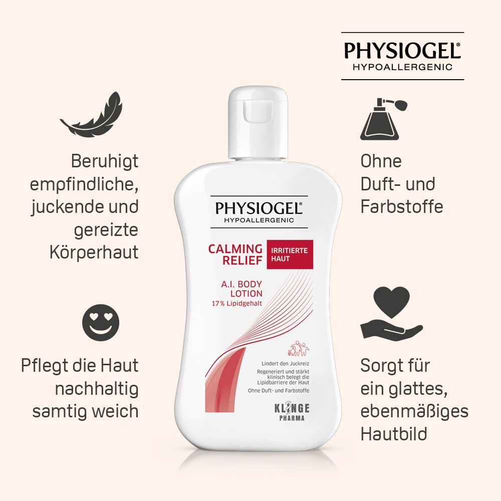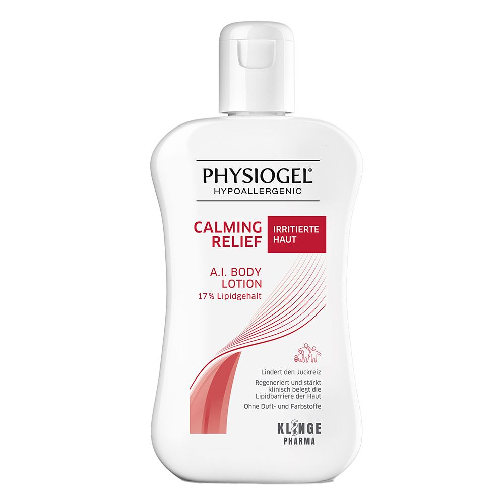 Physiogel Calming Relief A.I. Body Lotion ist eine hypoallergene Pflegelotion für den ganzen Körper, welche irritierte, gereizte oder juckende Haut schnell und langanhaltend beruhigt. Sie enthält einen Wirkkomplex aus hautverwandten Lipiden und N-Palmitoylethanolamin (Palmitamide MEA, PEA), der die Haut regeneriert und repariert. Die innovative PHYSIOGEL BioMimetic Technologie imitiert die lamellenartige Struktur der Haut und verwendet Inhaltsstoffe, die diese nachahmen, um trockene und empfindliche Haut nachhaltig zu reparieren und regenerieren. Die Body Lotion hat einen Lipidgehalt von 17% und ist auch bei Neurodermitis geeignet. Sie ist frei von Parfüm und Farbstoffen, hat eine hypoallergene Zusammensetzung und wurde von Dermatologen klinisch getestet. Sie kann ab dem ersten Tag für Babys und Kinder verwendet werden und wird zweimal täglich oder bei Bedarf auf die Haut aufgetragen. Die Inhaltsstoffe sind Aqua, CaprylicCapric Triglyceride, Glycerin, Pentylene Glycol, Butyrospermum Parkii Butter, Hydrogenated Lecithin, Palmitamide MEA, Hydroxyethylcellulose, Caprylyl Glycol, Xanthan Gum, Betaine, Squalane, Sarcosine, Acetamide MEA, Carbomer, Sodium Carbomer, Ceramide NP.