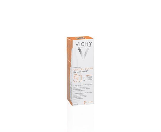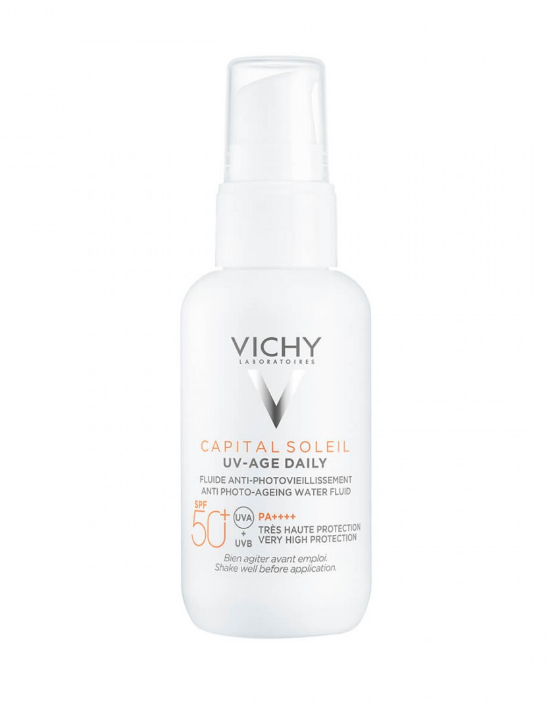 VICHY Capital Soleil UV-Age Daily LSF 50+ Sonnenfluid, der innovative, tägliche UV-Schutz mit Anti-Aging Korrektur. Das Anti-Aging-Fluid mit vulkanischem Wasser aus Vichy, probiotischen Extrakten, Anti-Aging Peptiden und Niacinamid bietet Schutz gegen UVA- & UVB-Strahlung und beugt gleichzeitig Falten, Pigmentflecken und oxidativem Stress vor - verursacht durch UV-Strahlen und Umwelteinflüsse.