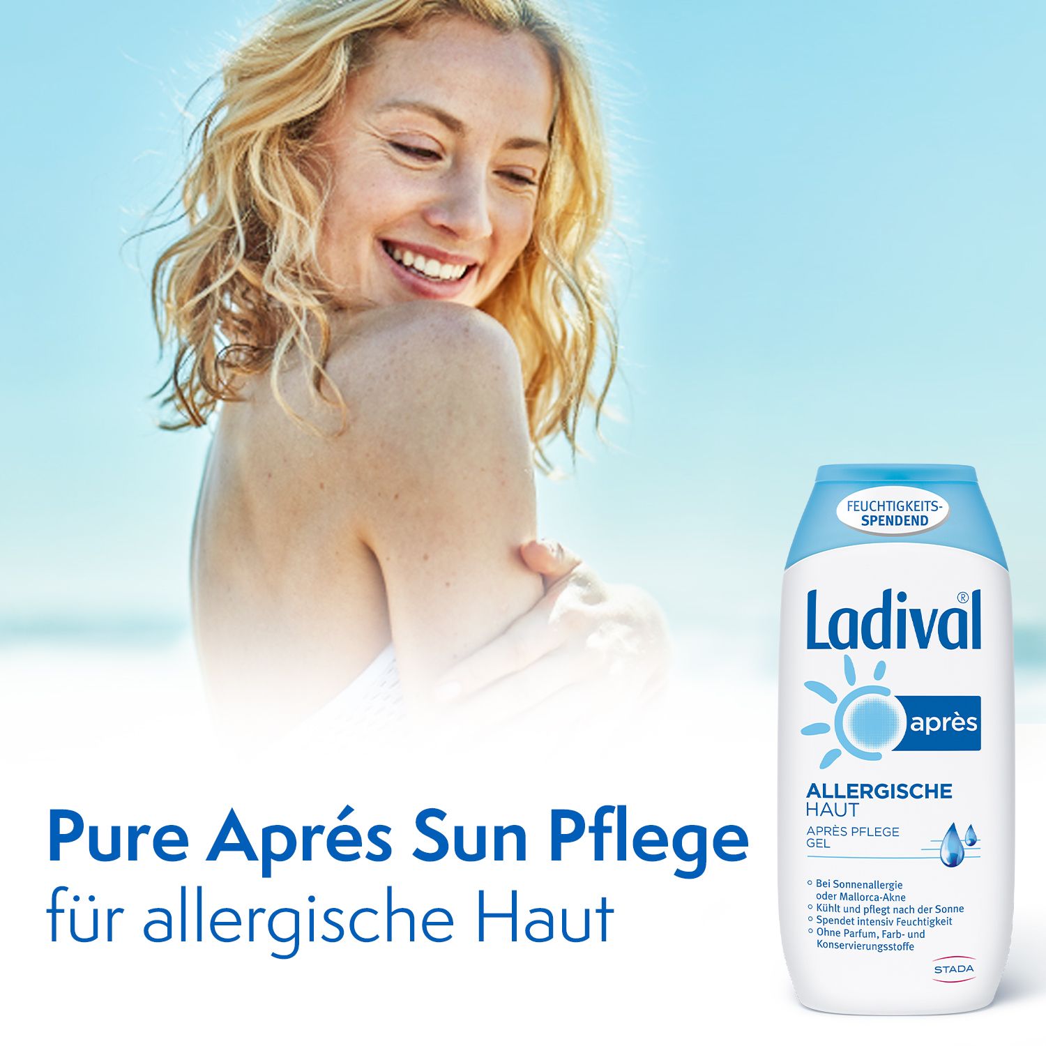 Das Ladival Apres Pflege Gel für allergische Haut ist frei von Emulgatoren. Es enthält Dexpanthenol und Allantoin, die intensiv Feuchtigkeit spenden und die durch die Sonne gereizte Haut beruhigen. Vitamin E hilft dabei, vorzeitiger Hautalterung vorzubeugen. Das Apres Pflege Gel zieht leicht ein, kühlt angenehm und hinterlässt ein zartes Hautgefühl, ohne zu kleben.
