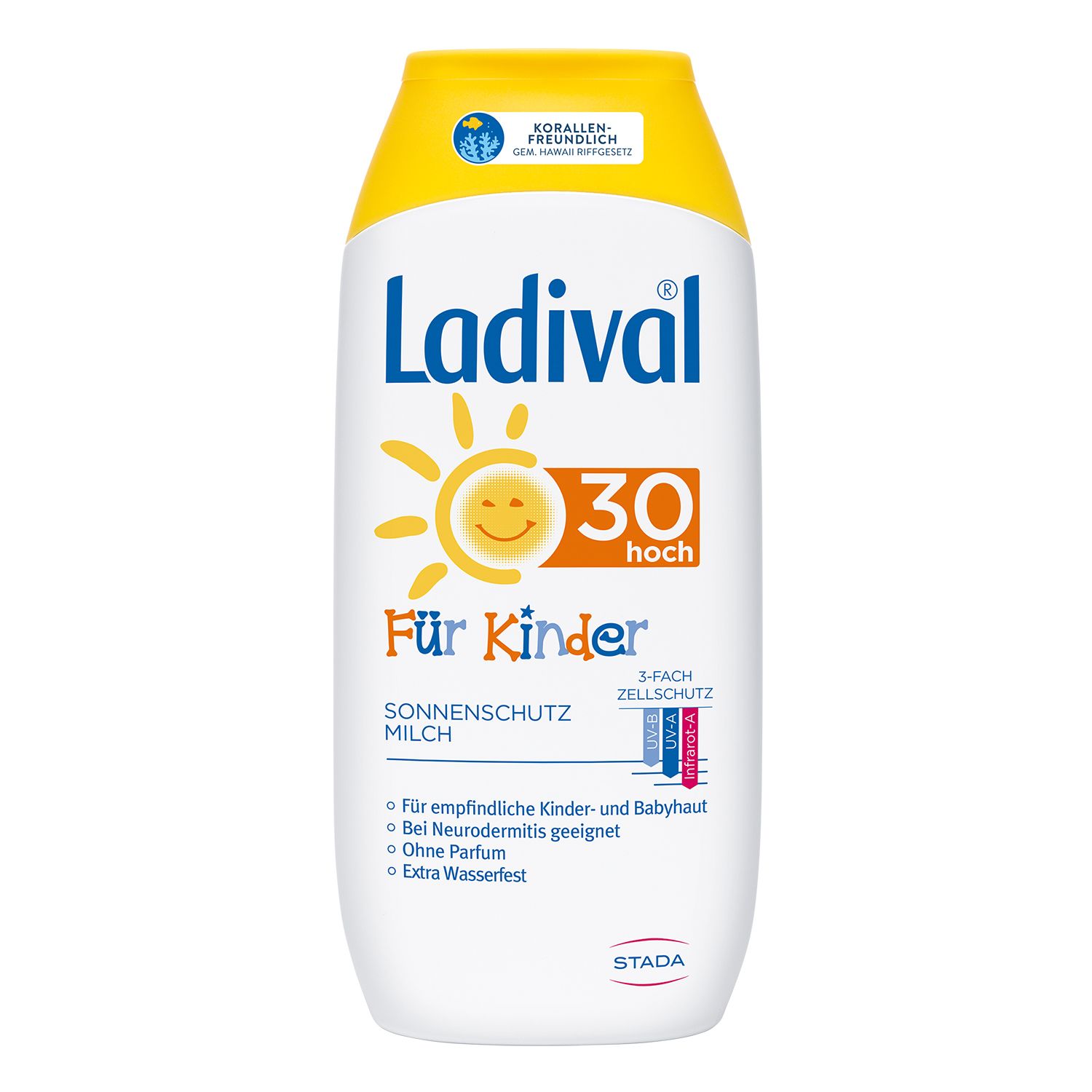 Die Haut von Kindern und Babys ist dünner und empfindlicher als die Haut von Erwachsenen und braucht deshalb besonderen Schutz vor der Sonne. Ladival hat speziell für die Bedürfnisse von Kinderhaut eine Sonnenmilch mit LSF 30 entwickelt. Diese reichhaltige Sonnenmilch schützt dank dem 3-fachen Zellschutz von Ladival gegen UVA-, UVB- und IR-A-Strahlung. Sie ist bei Neurodermitis geeignet und sorgt für ein angenehmes Hautgefühl. Um einen zuverlässigen Sonnenschutz zu gewährleisten, sollte die Sonnenmilch großzügig aufgetragen werden, wobei die "11-Fingerregel" helfen kann. Ladival hat in Tests bestätigt, dass der Schutz sofort nach dem Auftragen eintritt. Außerdem ist Ladival hautverträglich und korallenfreundlich. Für Kinder unter zwei Jahren sollte die direkte Sonnenexposition vermieden werden. Für diese Altersgruppe empfiehlt sich eine Eincremung mit einer Ladival-Sonnenmilch aus der Serie Für Kinder. Für Kinder über 3 Jahren eignet sich auch die Ladival für empfindliche Haut Lotion oder Creme.