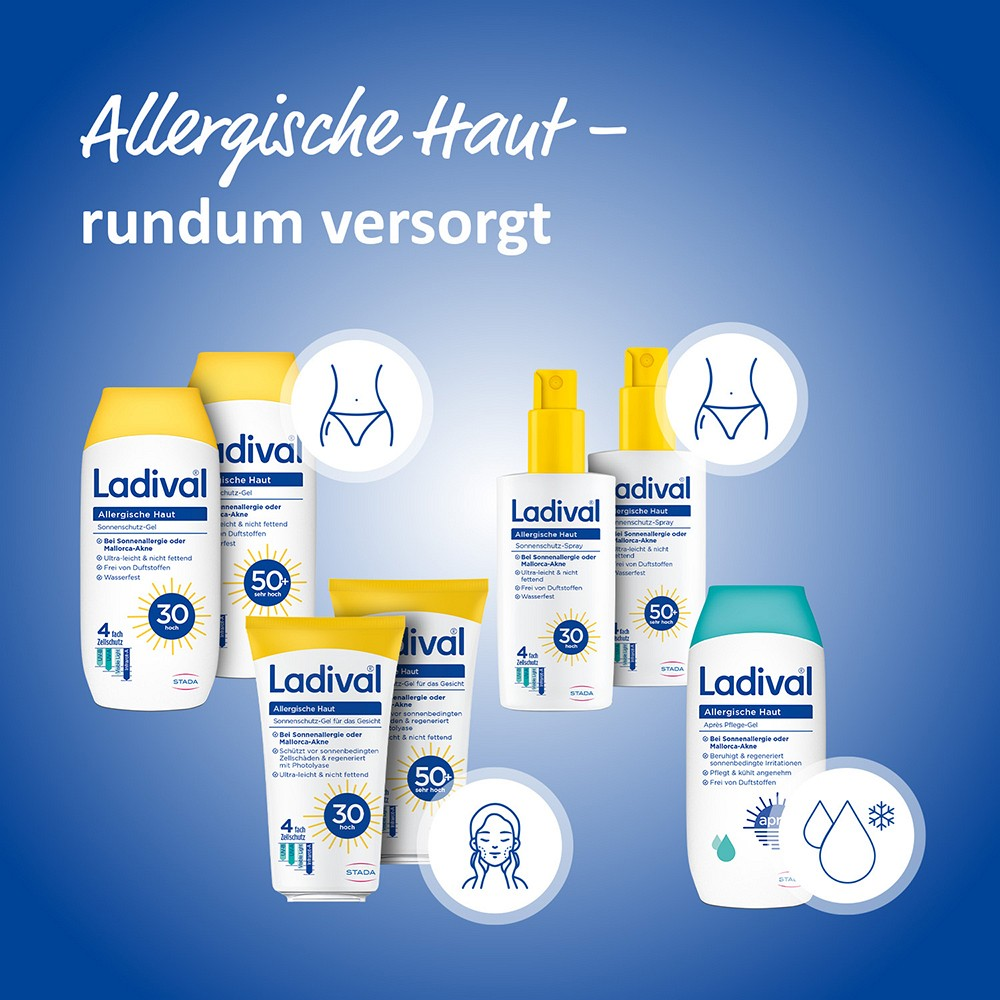 Die Ladival Allergische Haut Serie ist eine fett- und vollkommen emulgatorfreie Formulierung und eignet sich dadurch besonders bei Sonnenallergie und Mallorca-Akne, aber auch bei öliger Haut, die zu Akne neigt. Das Sortiment bietet aus diesem Grund auch ein Apres Pflege Gel - denn auch nach der Sonne sollten keine emulgatorhaltigen Produkte verwendet werden (Emulgatoren können bis zu 24 Std. in der Haut verbleiben).