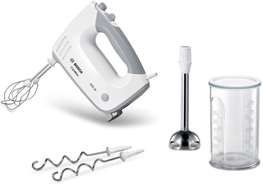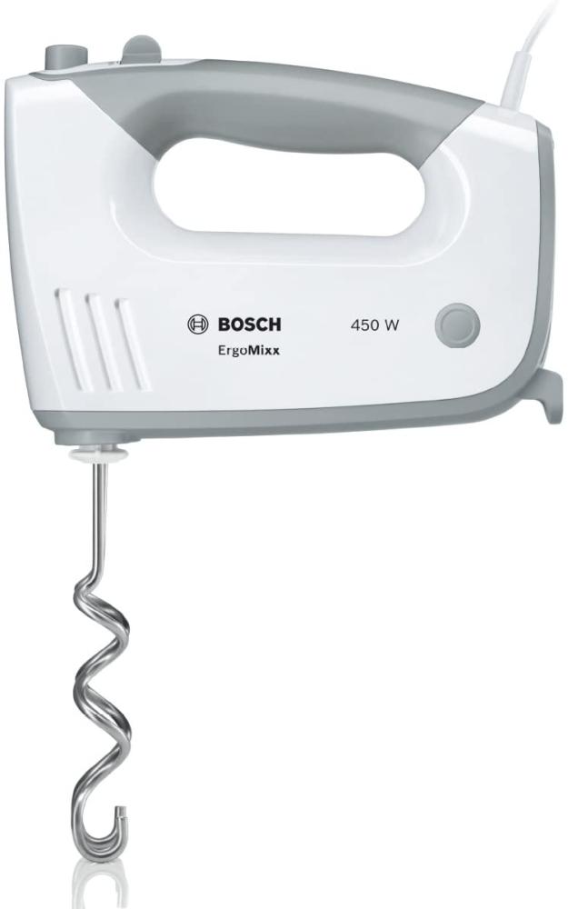 - 450 Watt - Moderne Motortechnik: Kraftvoll, leise und leicht - Optimale Handhabung durch ergonomisches Design, große Tasten und griffiges Soft-Touch-Gehäuse - 5 Geschwindigkeitsstufen mit unterschiedlicher Drehzahl - Zusätzliche Moment- / Turbo-Stufe - Separate Auswurftaste für Rührbesen und - Knethaken - 2 hocheffiziente Turbobesen für optimales Schlag- und Rührergebnis - 2 stabile Knethaken - Kabel wird zum Verstauen schnell und platzsparend aufgewickelt - Anschlussmöglichkeit für Stabmixer-Zubehör - Sekundenschnelles Anschließen und Abnehmen eines Mixfußes durch patentiertes Klicksystem - Hochwertiger Edelstahl-Mixfuß