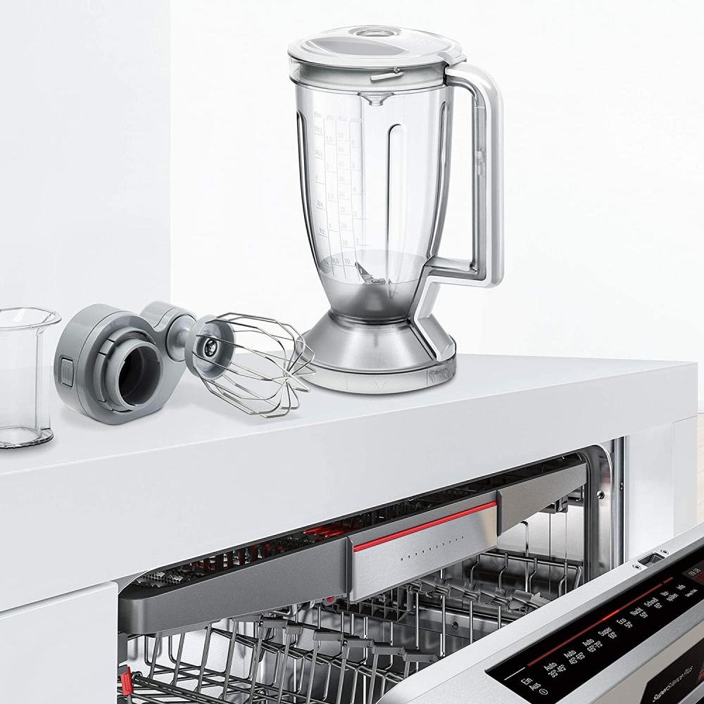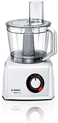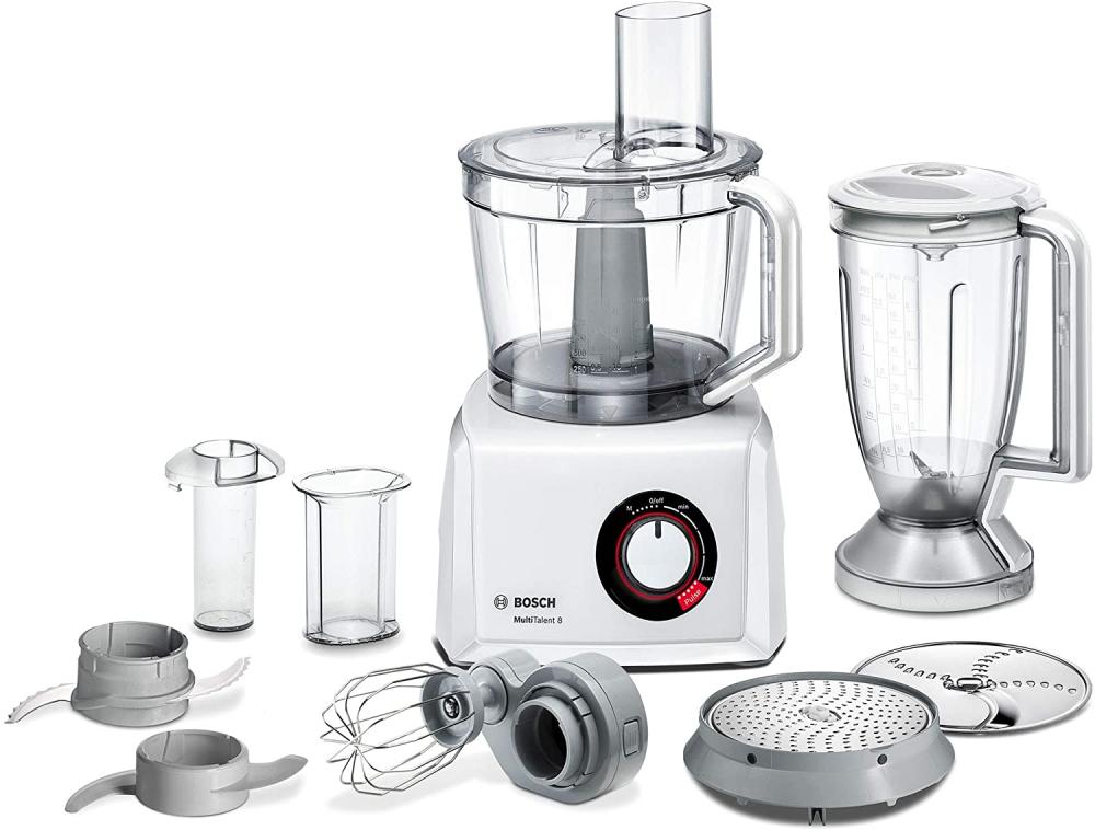 Enthaltenes Zubehör - Große 3,9 l Kunststoff-Rührschüssel transparent für 750 g Mehl + Zutaten (max. Teigmenge 1.5 kg) inkl. Deckel mit Einfüllhilfe und Stopfer. - Mixer-Aufsatz Kunststoff, nutzbares Fassungsvermögen 1,5 Liter. - Kartoffelpuffer-Rösti-Scheibe. - Reibscheibe mittelfein. - Scheiben aus Edelstahl. - Teigwerkzeug aus Kunststoff. - Scheibenträger für maximale Stabilität. - Rührbesen (Edelstahl) für Sahne, Eischnee und leichte Teige.