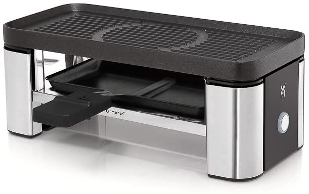 - Raclette aus Cromargan für zwei . - WMF High Performance mit 370 Watt. - Antihaftbeschichtete Wendegrillplatte mit einer gerippten Seite für eine Grilloptik oder auf der flachen Seite für Gemüse. - Zwei kleine Raclette Pfännchen mit Antihaftbeschichtung für individuellen Raclette Genuss. - Ein großes Maxi-Pfännchen eignet sich perfekt für große oder längliche Zutaten wie Spargel, Lauch, Karotten oder Spiegelei. - Flexibel positionierbaren Parkstationen für das abstellen der heißen Pfännchen oder das große Maxi-Pfännchen. - Das Schokoladenfondue mit einer Keramikschale und zwei Cromargan Spießen bildet den süßen Abschluss des gemütlichen Menüs zu zweit. - Alle Komponenten sind hygienisch in der Spülmaschine zu reinigen.