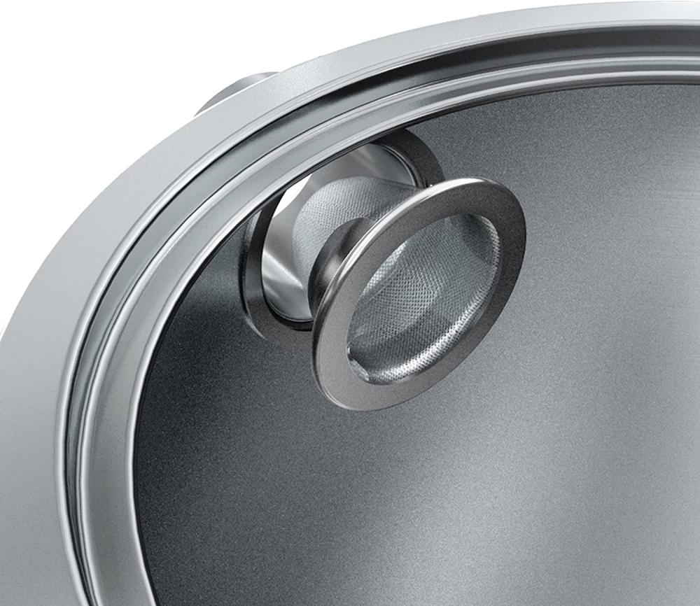 Er schaltet sich mit der Lift-Off Funktion automatisch ab, sobald man ihn während dem Kochvorgang abhebt. Der herausnehmbare Kalkfilter erleichtert das Reinigen. Der Deckel öffnet sich einfach auf Knopfdruck. Der Ein-Ausschalter ist mit einer blauen Kontrolllampe ausgestattet.