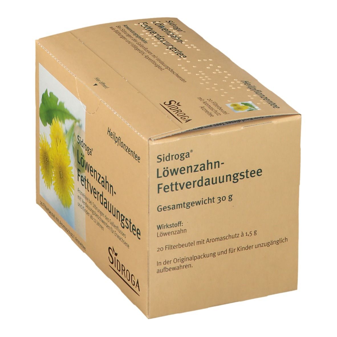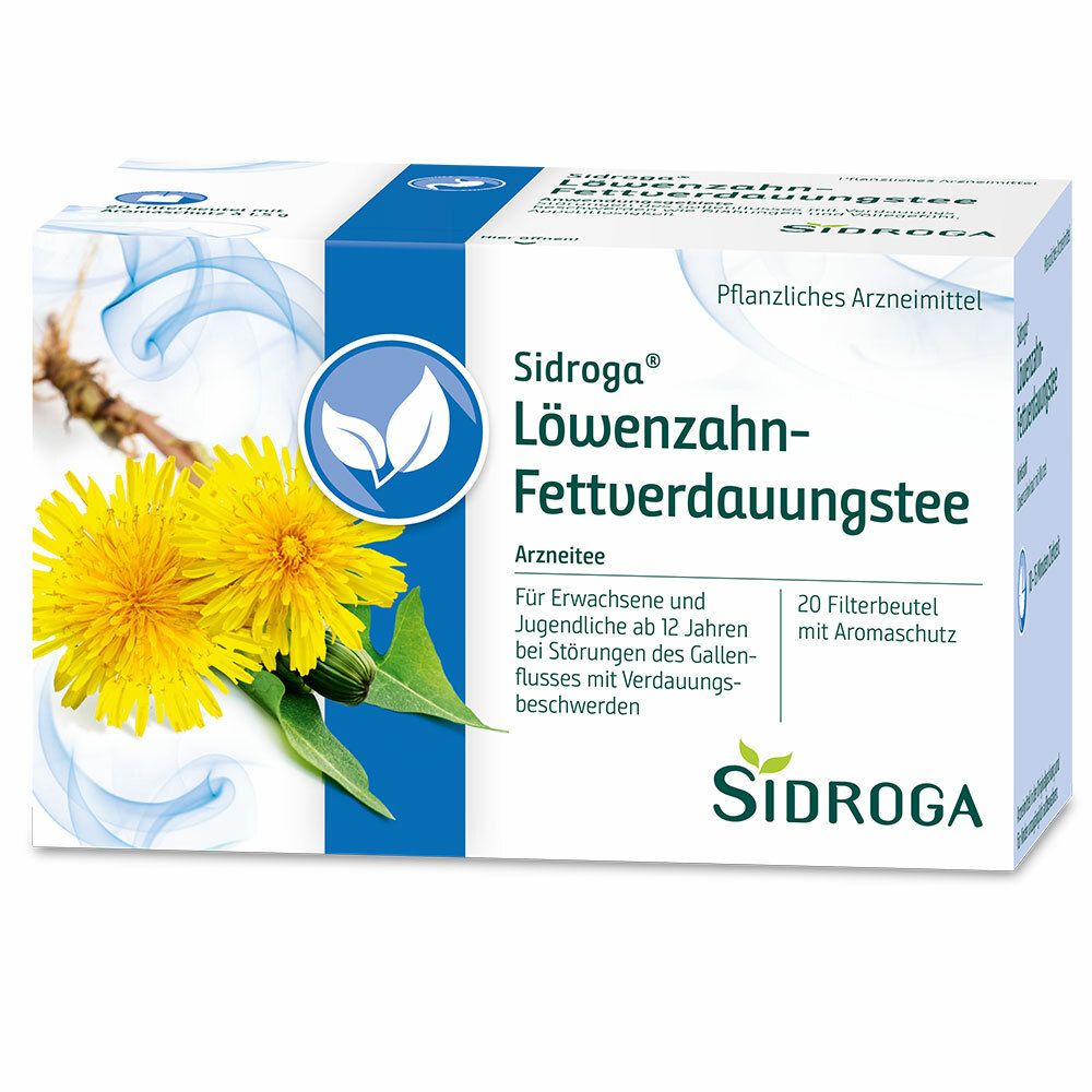Sidroga® Löwenzahn-Fettverdauungstee ist ein pflanzliches Arzneimittel, das bei Verdauungsbeschwerden angewendet wird. Es enthält Löwenzahn, eine bewährte Heilpflanze, deren oberirdische Teile und Wurzelstock im Frühjahr vor der Blüte geerntet, getrocknet und verwendet werden. Die Inhaltsstoffe regen die Bildung von Gallensäuren an und fördern somit die Verdauung bei Störungen des Gallenflusses mit Verdauungsbeschwerden wie Blähungen, Völlegefühl und Appetitlosigkeit. Die Zubereitung besteht aus 1 bis 2 Filterbeuteln, die mit siedendem Wasser übergossen und für 10 bis 15 Minuten ziehen gelassen werden. Es wird empfohlen, 2- bis 3-mal täglich eine Tasse des Teeaufgusses jeweils eine halbe Stunde vor den Mahlzeiten zur Appetitanregung zu trinken oder ansonsten nach den Mahlzeiten. Jeder Filterbeutel enthält 1,5 g Löwenzahn als arzneilich wirksamen Bestandteil. Bitte verwenden Sie das Arzneimittel nicht mehr nach dem Verfallsdatum, das auf der Packung oder Umverpackung angegeben ist.