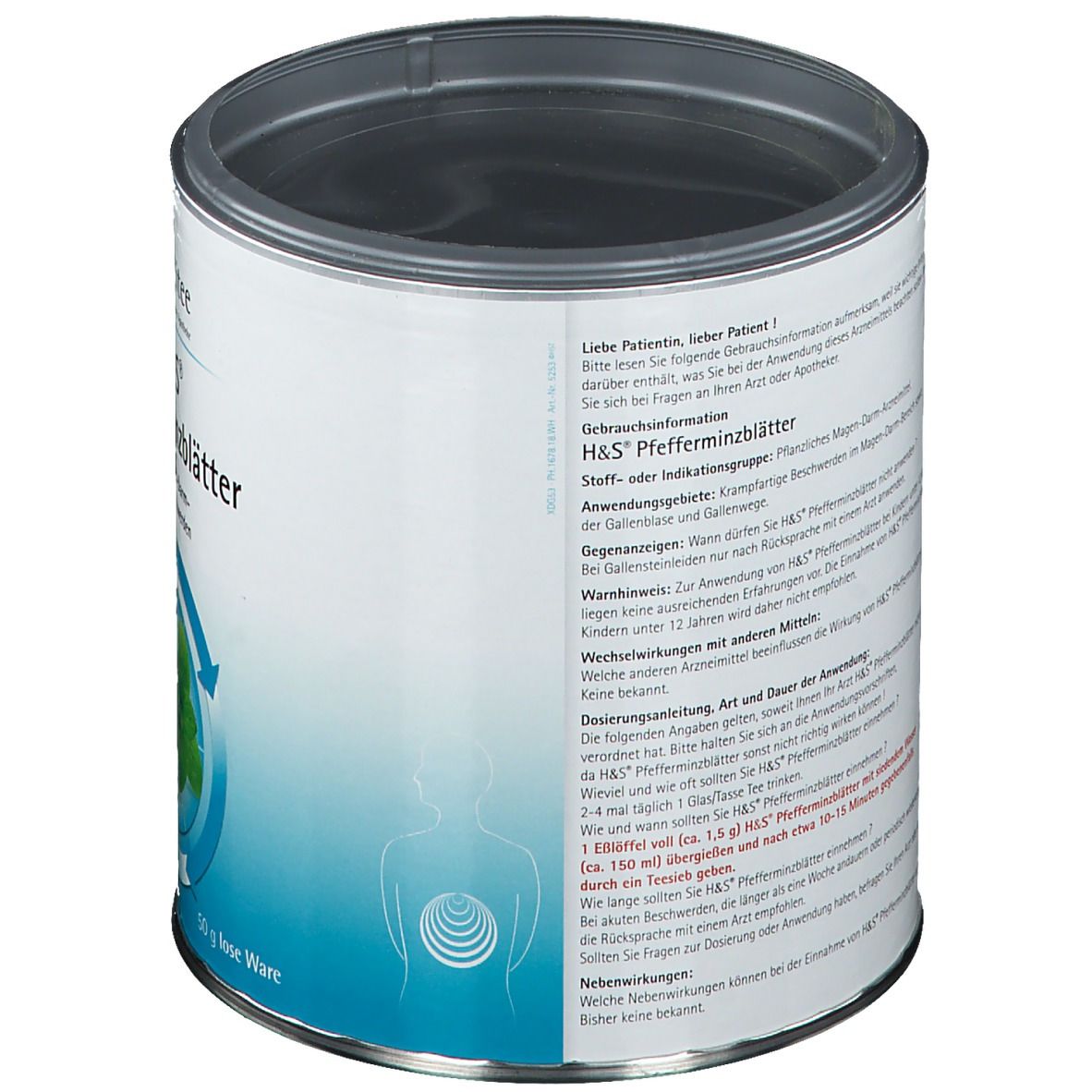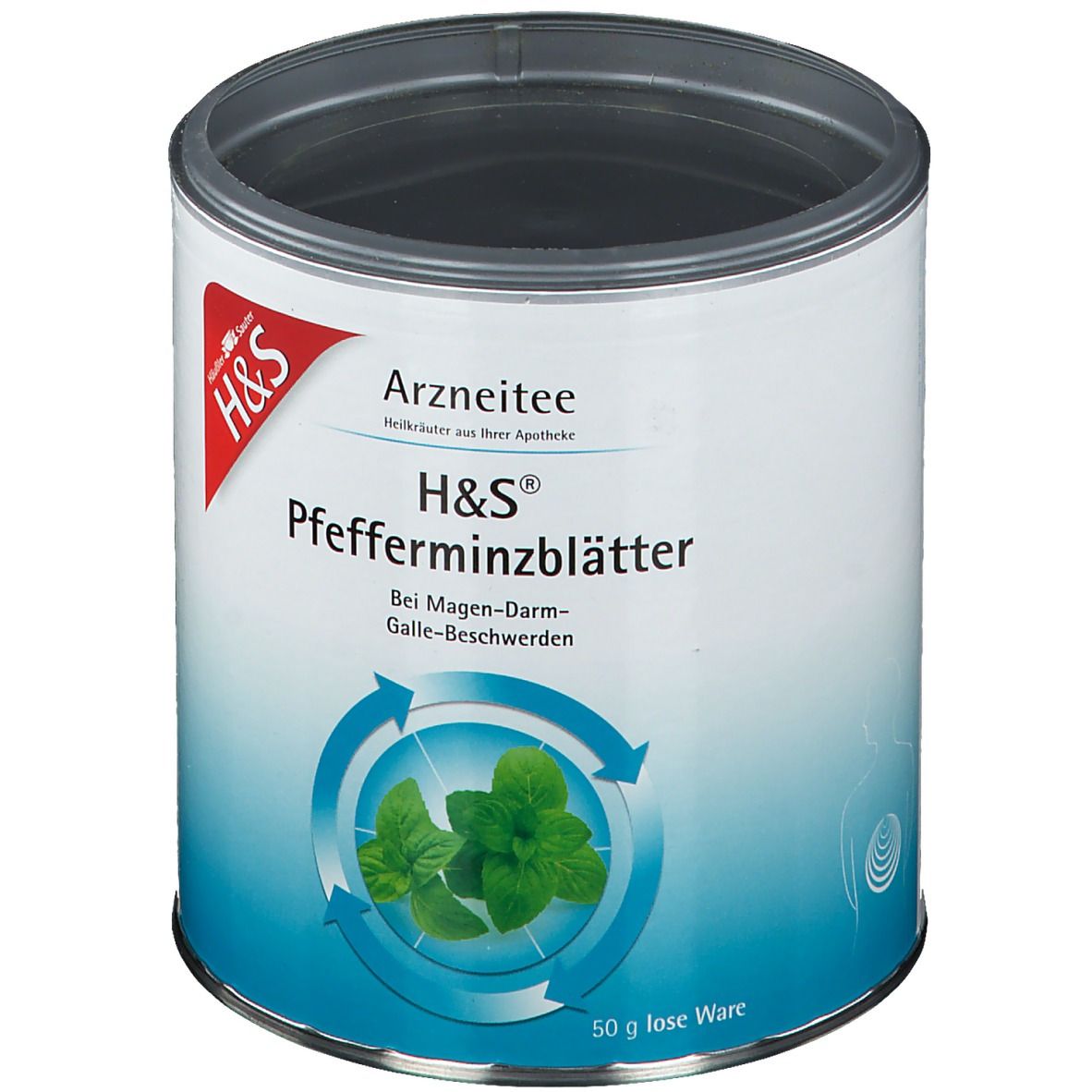 Gruppe von pflanzlichen Arzneimitteln für Magen-Darm-Beschwerden mit Anwendungsgebieten bei krampfartigen Beschwerden im Magen-Darm-Bereich sowie der Gallenblase und Gallenwegen. Das spezifische Arzneimittel in diesem Fall sind H&S Pfefferminzblätter, welche bei Gallensteinleiden nur nach Rücksprache mit einem Arzt angewendet werden sollten. Es sind keine Wechselwirkungen mit anderen Arzneimitteln bekannt. Die empfohlene Dosierung ist 2-4 mal täglich 1 Tasse Tee. H&S Pfefferminzblätter sollten mit siedendem Wasser übergossen und nach 10-15 Minuten durch ein Teesieb gegeben werden. Bei akuten Beschwerden, die länger als eine Woche andauern oder periodisch wiederkehren, wird eine Rücksprache mit einem Arzt empfohlen. Bisher sind keine Nebenwirkungen bekannt. Die einzige arzneilich wirksame Bestandteil in 100 g Tee sind Pfefferminzblätter (Menthae piperitae folium).