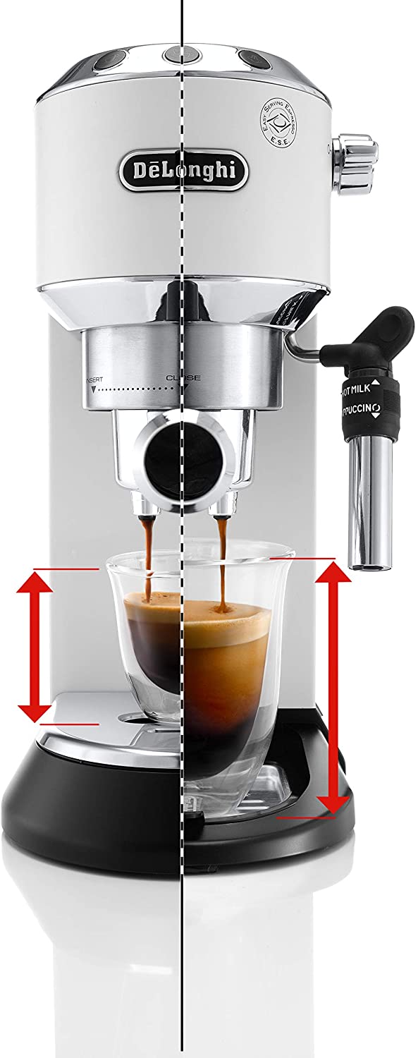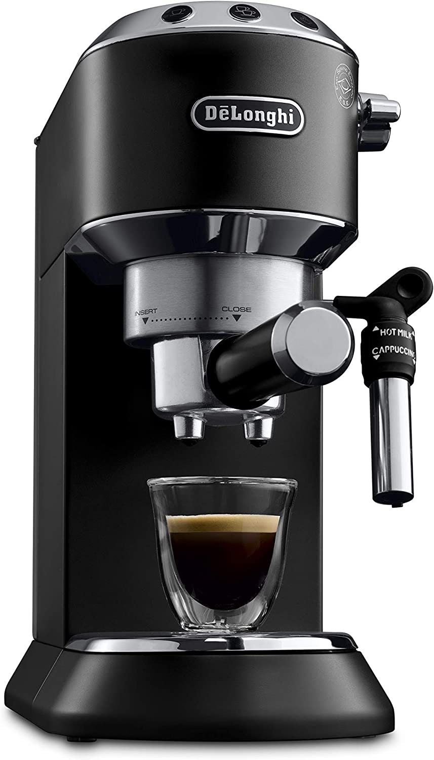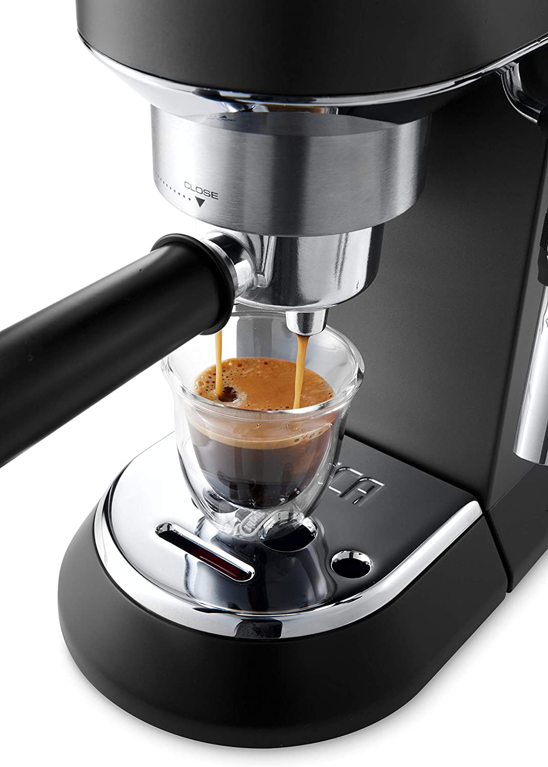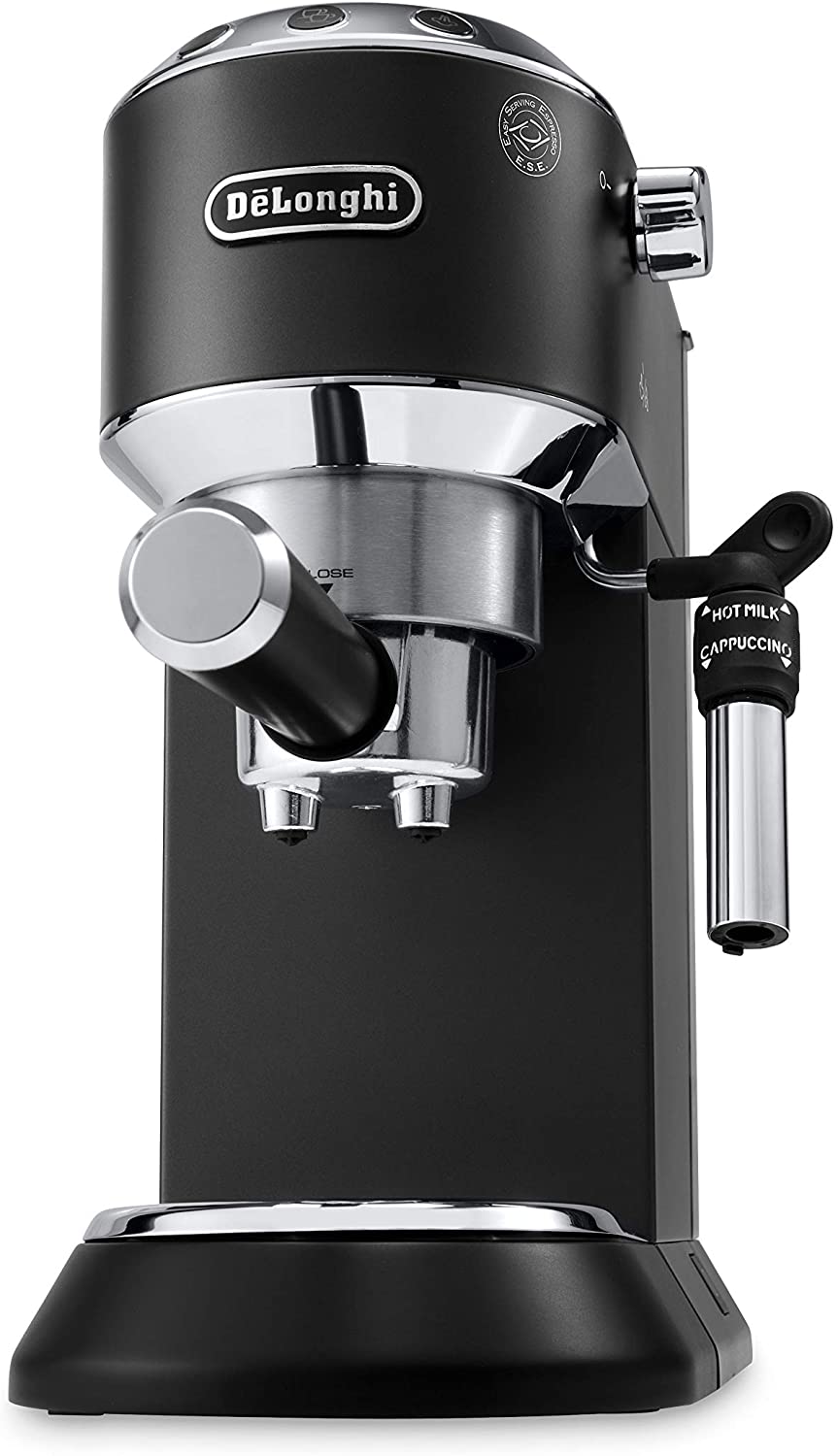 PRODUKTBESCHREIBUNGEN Farbe:Schwarz| Stil:Espresso SiebträgermaschinePRODUKTBESCHREIBUNG Die traditionelle Siebträgermaschine Dedica EC 685.BK von De'Longhi verfügt mit einer Breite von nur 15 cm über ein äußerst kompaktes Design und verwandelt damit selbst die kleinste Küche zur italienischen Kaffeebar und verwandelt Sie zum Barista. Dank elektronischer Temperaturkontrolle, individuell programmierbarer Tassenfüllmenge und schneller Einsatzbereitschaft bringt die Dedica Style immer ideale Ergebnisse, um köstlichen Espresso oder Kaffee herzustellen. Mit der Kombination aus professioneller Milchaufschäumdüse und höhenverstellbarer Tassenabstellfläche können Cappuccino, Latte Macchiato und andere Milch-Kaffeespezialitäten auch zu Hause stilecht in hohen Gläsern zubereitet werden. Die Maschine ist in 40 Sekunden betriebsbereit. Der Siebträger ist für 1 oder 2 Tassen sowie für Kaffeepads geeignet. Das Sieb ist herausnehmbar. Die Farben mit trendy Matt-Finishing und geprägtem Dedica Logo unterstreichen das einzigartige Dedica Design. Lieferumfang De'Longhi Dedica Style EC 685.BK Siebträger Espressomaschine, schwarz MARKENBESCHREIBUNG De'Longhi – Better Everyday. Die Innovationen von De'Longhi, die herausragende Qualität und das unverwechselbare Design lassen Alltagsaufgaben zu einem besonderen Erlebnis werden. Wir entwickeln Produkte, die sich durch ihre Leistung und ihre Funktionalität, aber vor allem durch Freude am Benutzen auszeichnen. Unser Ziel ist es, mit all unseren Produkten, Techniken und Herangehensweisen etwas Besonderes zu bieten. Wir entwerfen funktionale Produkte mit eleganten, klaren Formen, innovativen Farbkombinationen und aus hochwertigen Materialien, angepasst an die individuellen Anforderungen in den Haushalten weltweit. RECHTLICHE HINWEISE "-" Mehr