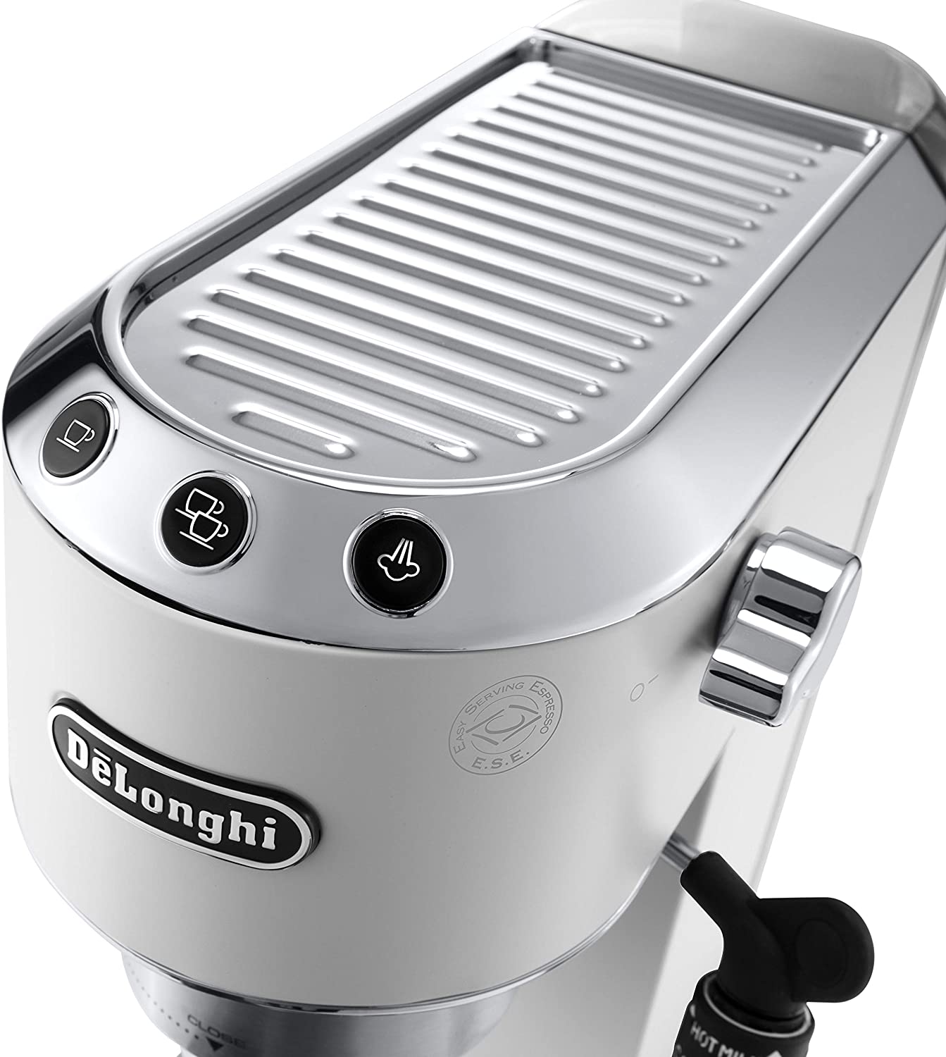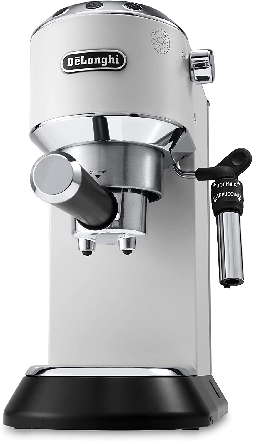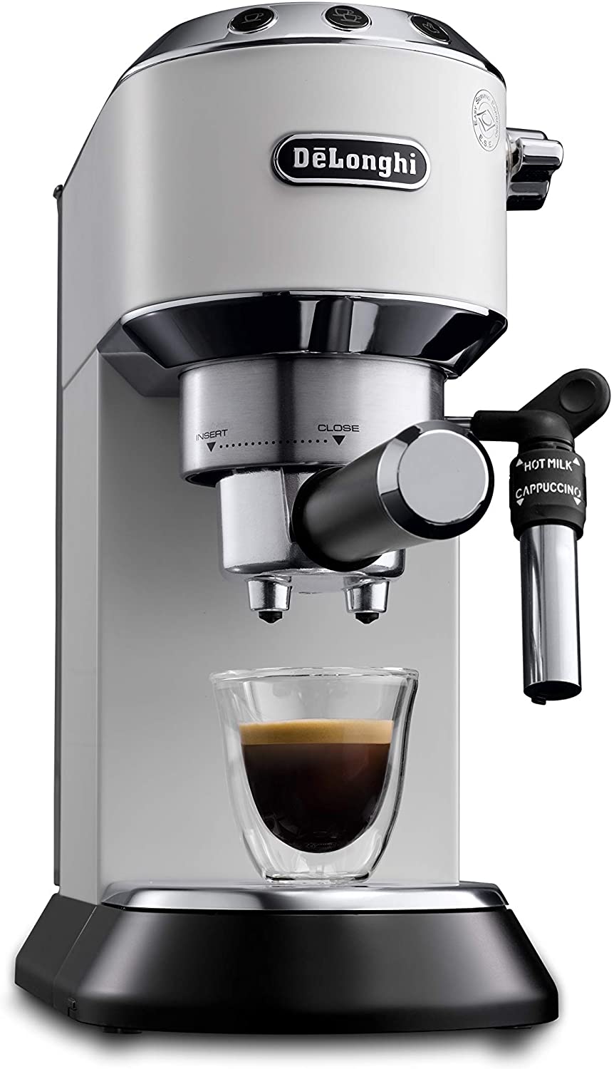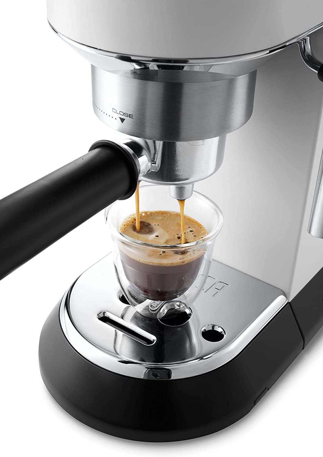 PRODUKTBESCHREIBUNGEN Farbe:Schwarz| Stil:Espresso SiebträgermaschinePRODUKTBESCHREIBUNG Die traditionelle Siebträgermaschine Dedica EC 685.BK von De'Longhi verfügt mit einer Breite von nur 15 cm über ein äußerst kompaktes Design und verwandelt damit selbst die kleinste Küche zur italienischen Kaffeebar und verwandelt Sie zum Barista. Dank elektronischer Temperaturkontrolle, individuell programmierbarer Tassenfüllmenge und schneller Einsatzbereitschaft bringt die Dedica Style immer ideale Ergebnisse, um köstlichen Espresso oder Kaffee herzustellen. Mit der Kombination aus professioneller Milchaufschäumdüse und höhenverstellbarer Tassenabstellfläche können Cappuccino, Latte Macchiato und andere Milch-Kaffeespezialitäten auch zu Hause stilecht in hohen Gläsern zubereitet werden. Die Maschine ist in 40 Sekunden betriebsbereit. Der Siebträger ist für 1 oder 2 Tassen sowie für Kaffeepads geeignet. Das Sieb ist herausnehmbar. Die Farben mit trendy Matt-Finishing und geprägtem Dedica Logo unterstreichen das einzigartige Dedica Design. Lieferumfang De'Longhi Dedica Style EC 685.BK Siebträger Espressomaschine, schwarz MARKENBESCHREIBUNG De'Longhi – Better Everyday. Die Innovationen von De'Longhi, die herausragende Qualität und das unverwechselbare Design lassen Alltagsaufgaben zu einem besonderen Erlebnis werden. Wir entwickeln Produkte, die sich durch ihre Leistung und ihre Funktionalität, aber vor allem durch Freude am Benutzen auszeichnen. Unser Ziel ist es, mit all unseren Produkten, Techniken und Herangehensweisen etwas Besonderes zu bieten. Wir entwerfen funktionale Produkte mit eleganten, klaren Formen, innovativen Farbkombinationen und aus hochwertigen Materialien, angepasst an die individuellen Anforderungen in den Haushalten weltweit. RECHTLICHE HINWEISE "-" Mehr